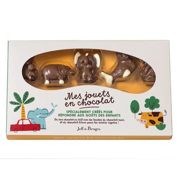 L’idée de cadeau idéale pour un enfant, du bon chocolat au lait avec des touches de chocolat noir et de chocolat blanc pour les rendre rigolos ! Ces figurines en forme d’animaux sont à croquer ! Vos enfants apprécieront à coup sûr cette jolie boite fabuleusement décorée, un assortiment créé spécialement pour répondre au goût des plus petits et les transporter dans l’univers du zoo.