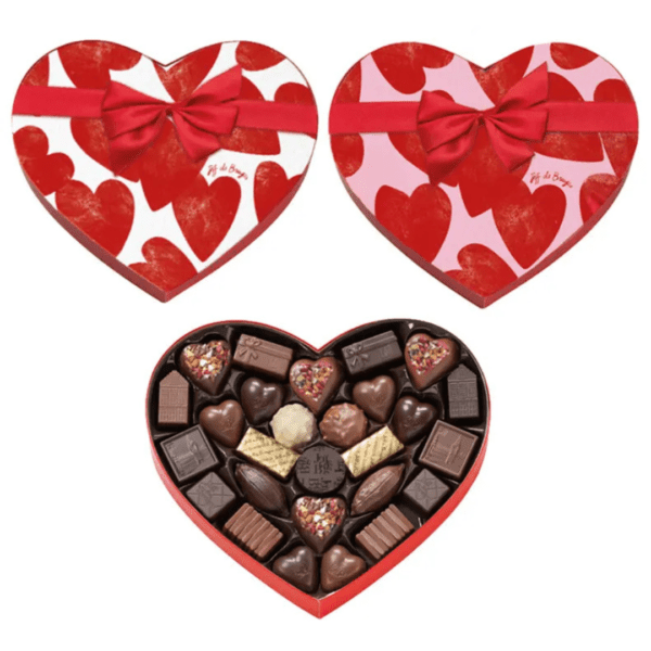 Cœurs éclats et Cœurs JB – chocolat au lait et chocolat noir assortis. Ingrédients : chocolat au lait (sucre, beurre de cacao, masse de cacao (fèves de cacao origine Équateur), LAIT entier en poudre, LAIT écrémé en poudre, émulsifiant : lécithines (SOJA), arôme naturel de vanille), chocolat noir (masse de cacao (fèves de cacao origine Équateur), sucre, matière grasse laitière (LAIT), beurre concentré (LAIT), beurre de cacao, émulsifiant : lécithines (SOJA), arôme naturel de vanille), pâte de NOISETTES, sucre, NOISETTES torréfiées et concassées, paillettes chocolat bronze (sucre, pâte de cacao, LAIT écrémé en poudre, agents d’enrobage : shellac et gomme arabique, émulsifiant : lécithine, colorants : oxyde et hydroxyde de fer), pâte de cacao, crumble (farine de BLÉ, sucre, beurre (LAIT), sel), crème (LAIT), humectant : glycérol, fruit de la passion, LAIT entier en poudre, beurre de karité, matière grasse de noix de coco, sirop de glucose, huile de tournesol, beurre concentré (LAIT), granules de meringue (sucre, blanc d’OEUF, amidon de maïs), pépites à la framboise (sucre, jus de framboise à base de concentré, dextrose, jus de citron à base de concentré, gélifiant : pectine, arôme naturel, colorant : concentré de carotte noire), AMANDES, LAIT écrémé, sirop de sucre inverti, groseilles lyophilisées, framboise déshydratée et lyophilisée, arômes naturels de vanille, de violette et de miel), miel, fleurs de violette odorante, sucre candi, NOISETTES, sirop de sucre, cacao maigre en poudre, cannelle, émulsifiant : lécithines (SOJA), concentré de pomme, concentré de groseilles noires, concentré de citron, concentré de radis, extrait de spiruline, agent d’enrobage : gomme arabique, correcteur d’acidité : acide citrique. Peuvent contenir des traces d’autres céréales contenant du gluten, d’œufs, de graines de sésame, d’autres fruits à coque et d’arachides.
